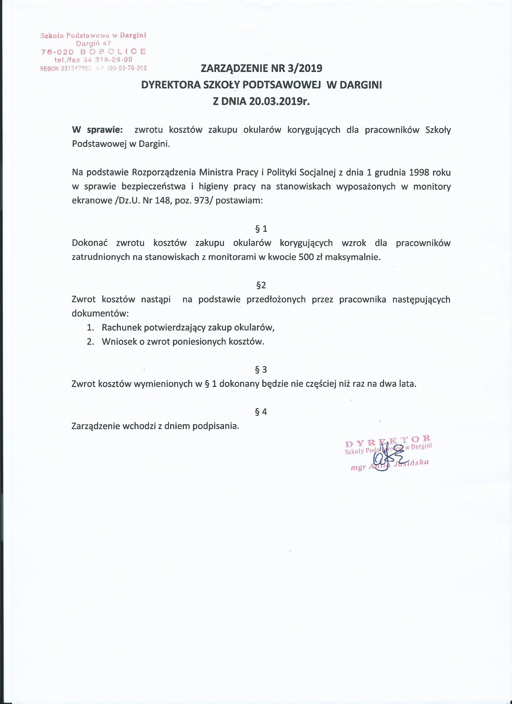 Zarządzenie dyrektora w sprawie zwrotu zakupu okularów korygujących dla pracowników Szkoły Podstawowej w Dargini